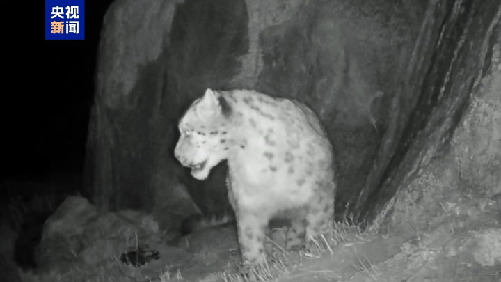 画面中,雪豹灰白色皮毛、黑色斑环与岩石环境完美融合,正机警地巡视领地,其健硕的体态与长尾展现出对高海拔环境的独特适应能力。此次夜间发现进一步证实该区域为雪豹提供了安全的栖息环境。