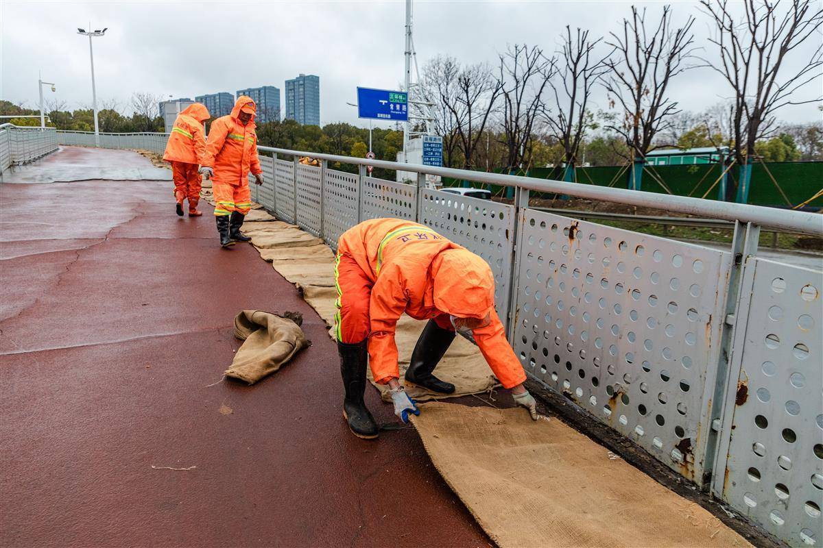 武汉江城天美保洁有限公司相关负责人邓威介绍:“江汉区目前已配备麻袋2.6万条,可根据需求快速铺设于人行天桥、公交站点、地下通道等易结冰区域,防范行人滑倒风险。目前,三环线常湾人行天桥、新湾人行天桥、黄家大湾人行天桥等三座人行天桥麻袋已铺设到位,融雪剂也就近投放,将视天气情况进行人工撒布。”